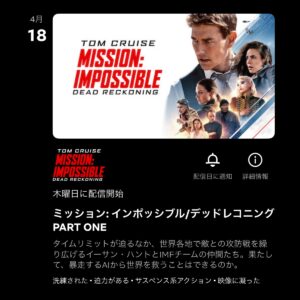 Netflix(ネトフリ)の映画「ミッション: インポッシブル/デッドレコニング PART ONE」は、2024年4月18日より配信開始されます。