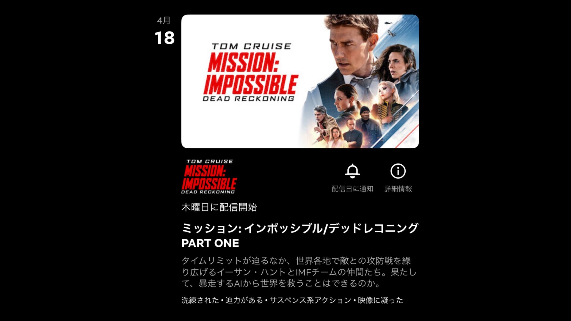 皆さんも、Netflixで映画「ミッション: インポッシブル/デッドレコニング PART ONE」や、映画、ドラマ、アニメ、ドキュメンタリーなどを楽しんでみてはいかがでしょうか。