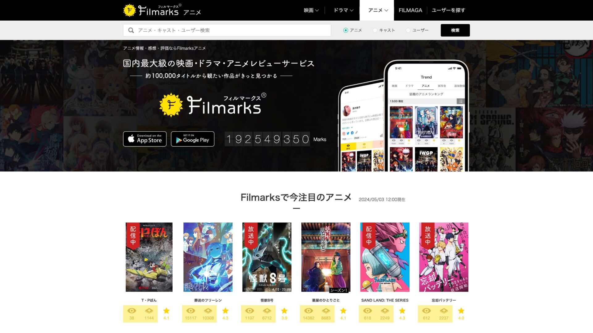 フィルマークスは、アニメの評価が見れるレビューサイトで、どのアニメが面白いのか参考にする際に役に立ちます。
