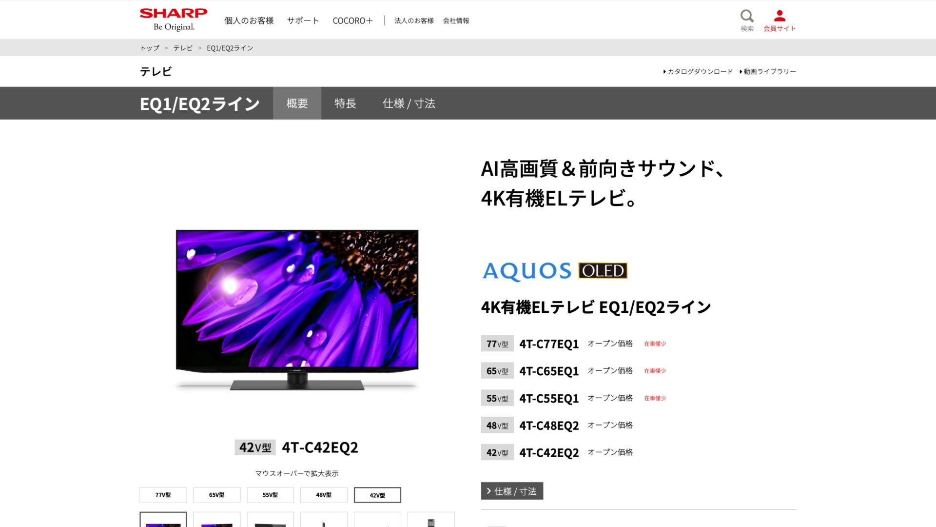 4台目は、「シャープ EQ2」で、2022年発売の4K有機ELテレビです。