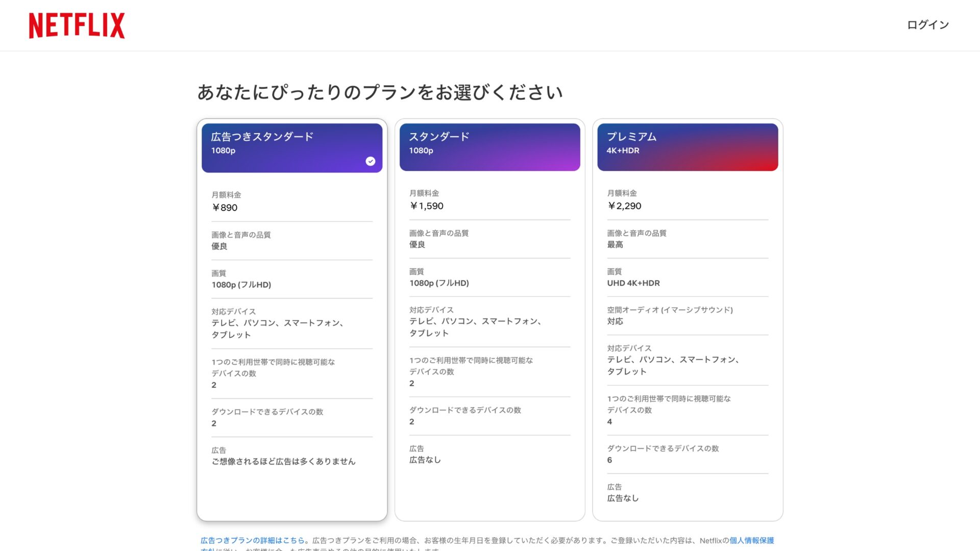 広告つきはスタンダートと同じ1080p画質、2画面再生に対応しながらも、価格は700円(約44%)安く利用できるためです。