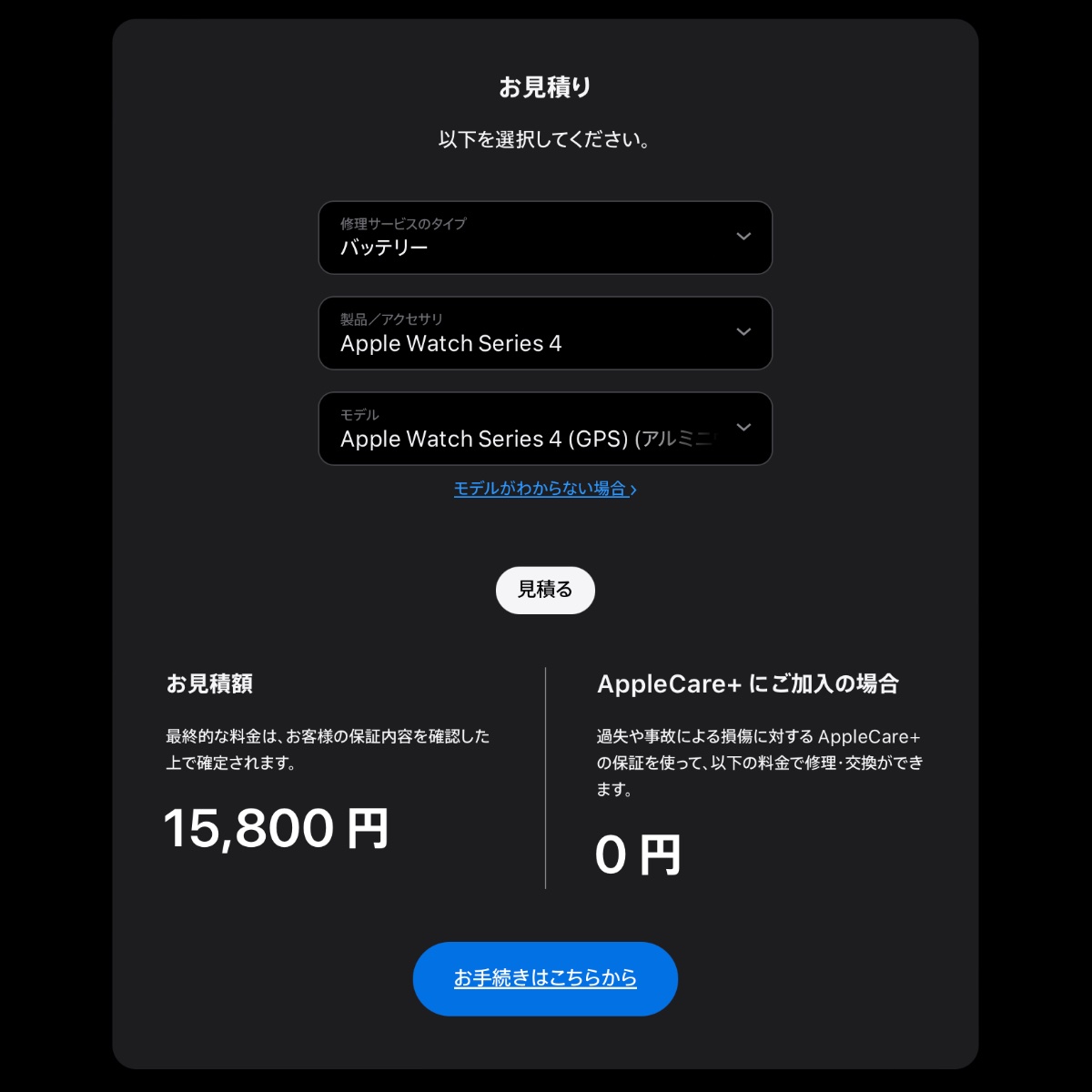 「Apple Watch」のバッテリー交換の料金は、アップル公式のサポートで¥12,800~¥15,800となっています(24年1月15日時点 参考: Apple Watch の修理サービス料金)。