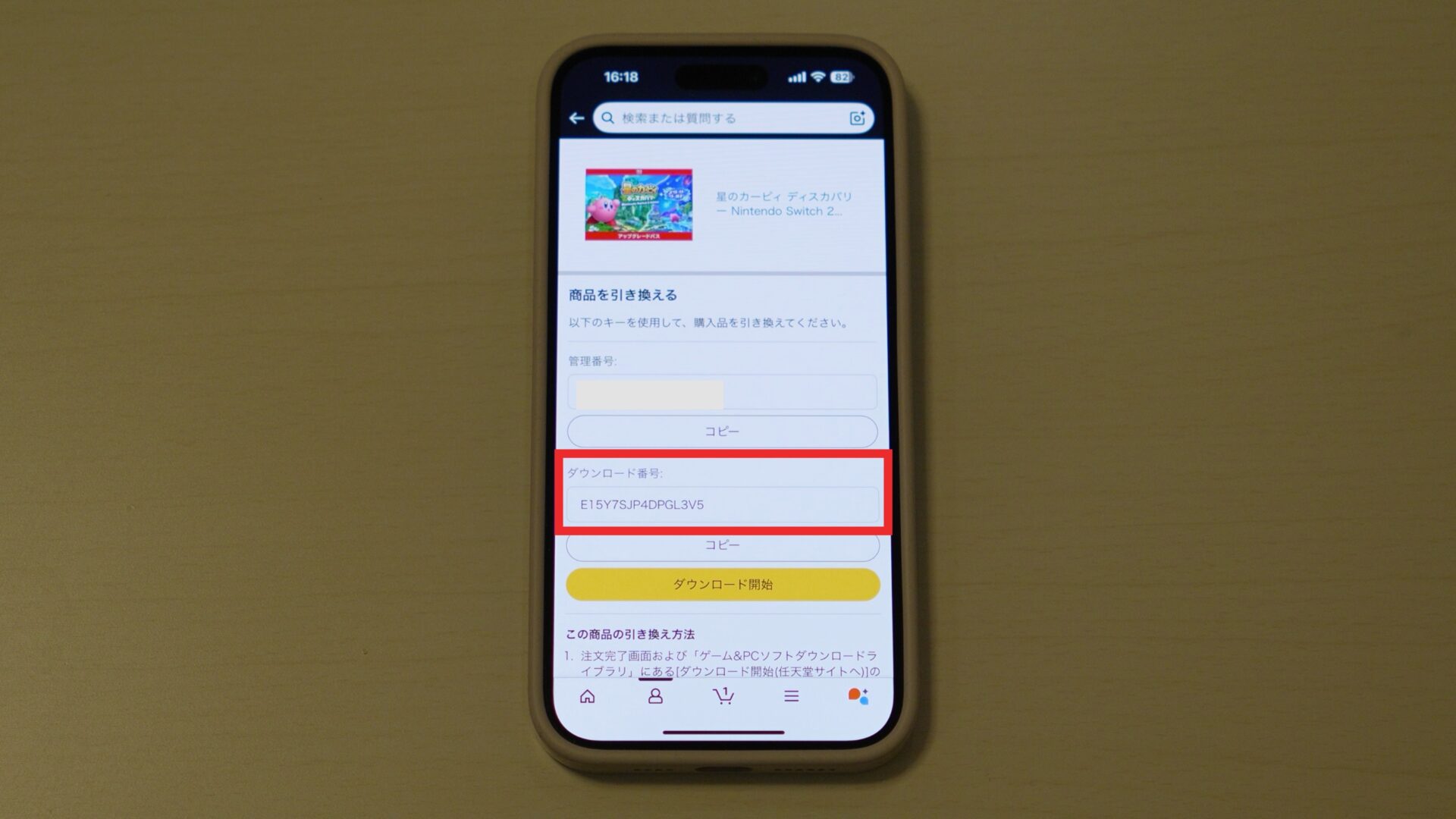 AmazonでSwitch 2のダウンロード版ソフトを買うと、注文履歴から番号を確認できます。