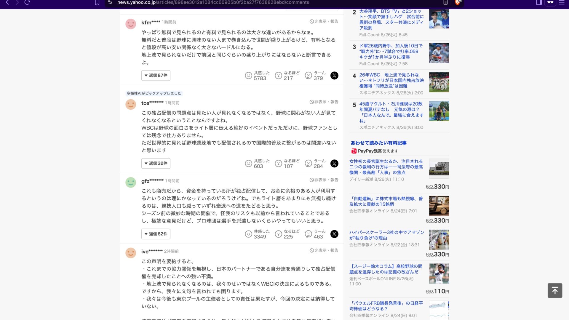 ヤフコメでは、「無料で見れないなら、盛り上がらない」、といった趣旨のコメントで溢れています。